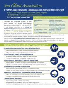 Highlights of Louisiana Sea Grant’s impact in 2024 (the most recent reporting year) can be found in our Putting Science to Work for Coastal Communities handout. Additionally, Fiscal Year 2027’s appropriations request can be found on the Sea Grant Association’s bulletin.